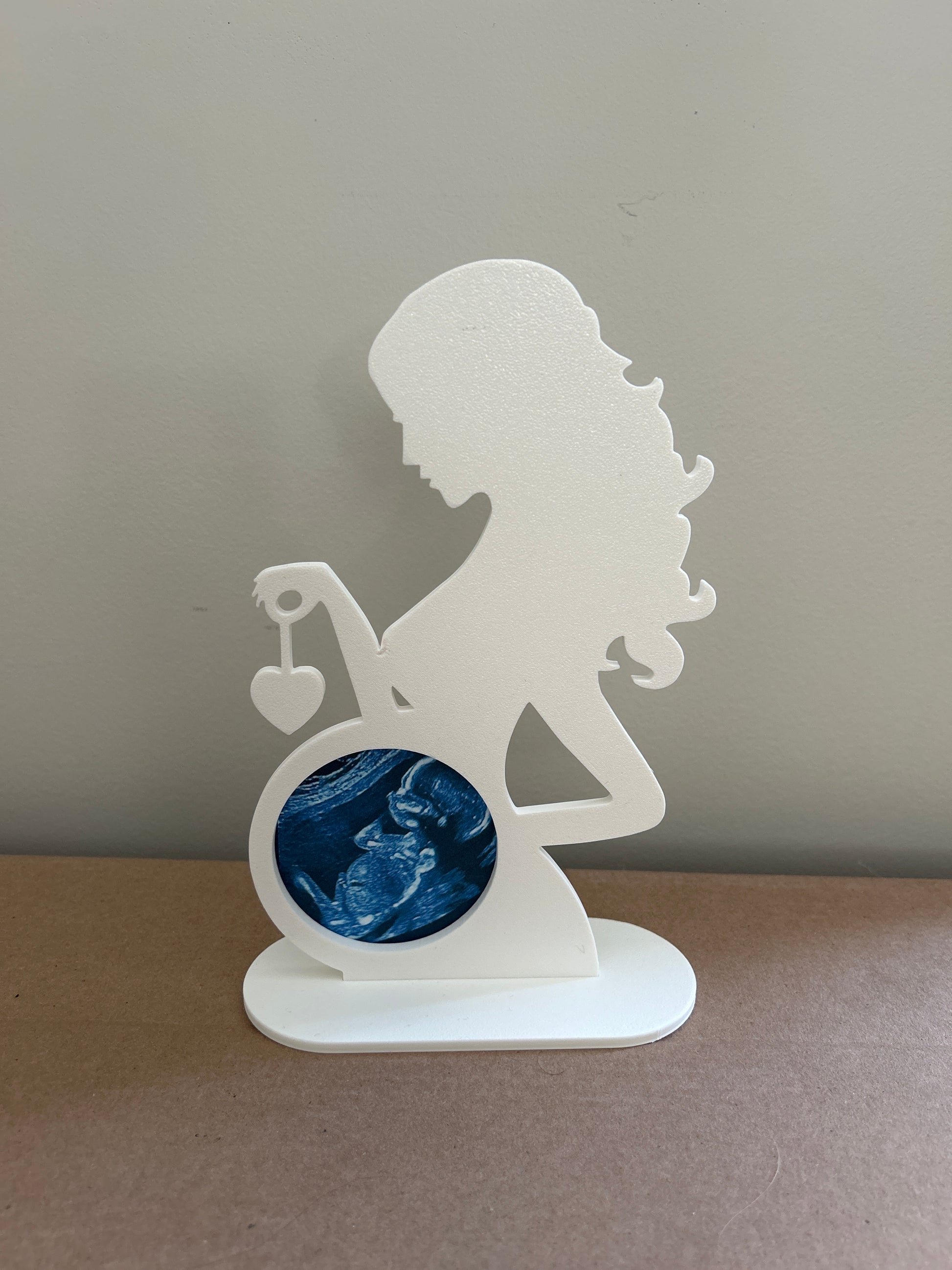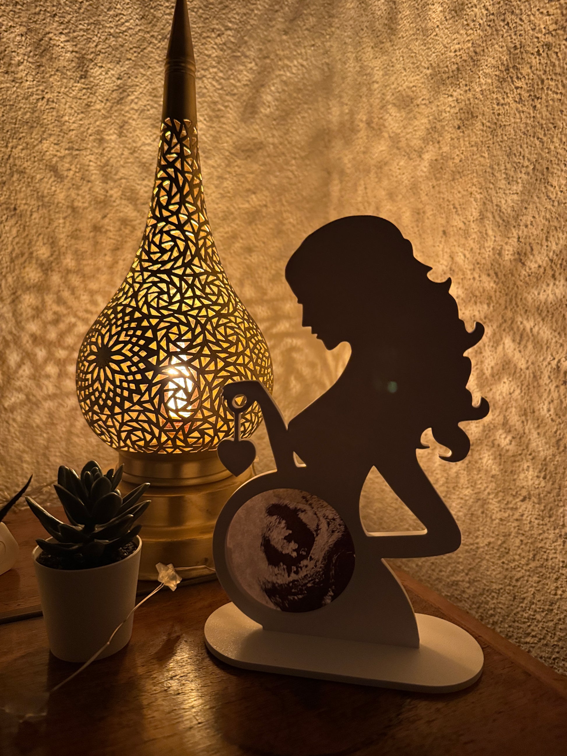 Com a silhueta delicada de uma mãe e um espaço especial na barriga para encaixar a foto, ele transforma a lembrança em decoração cheia de significado.